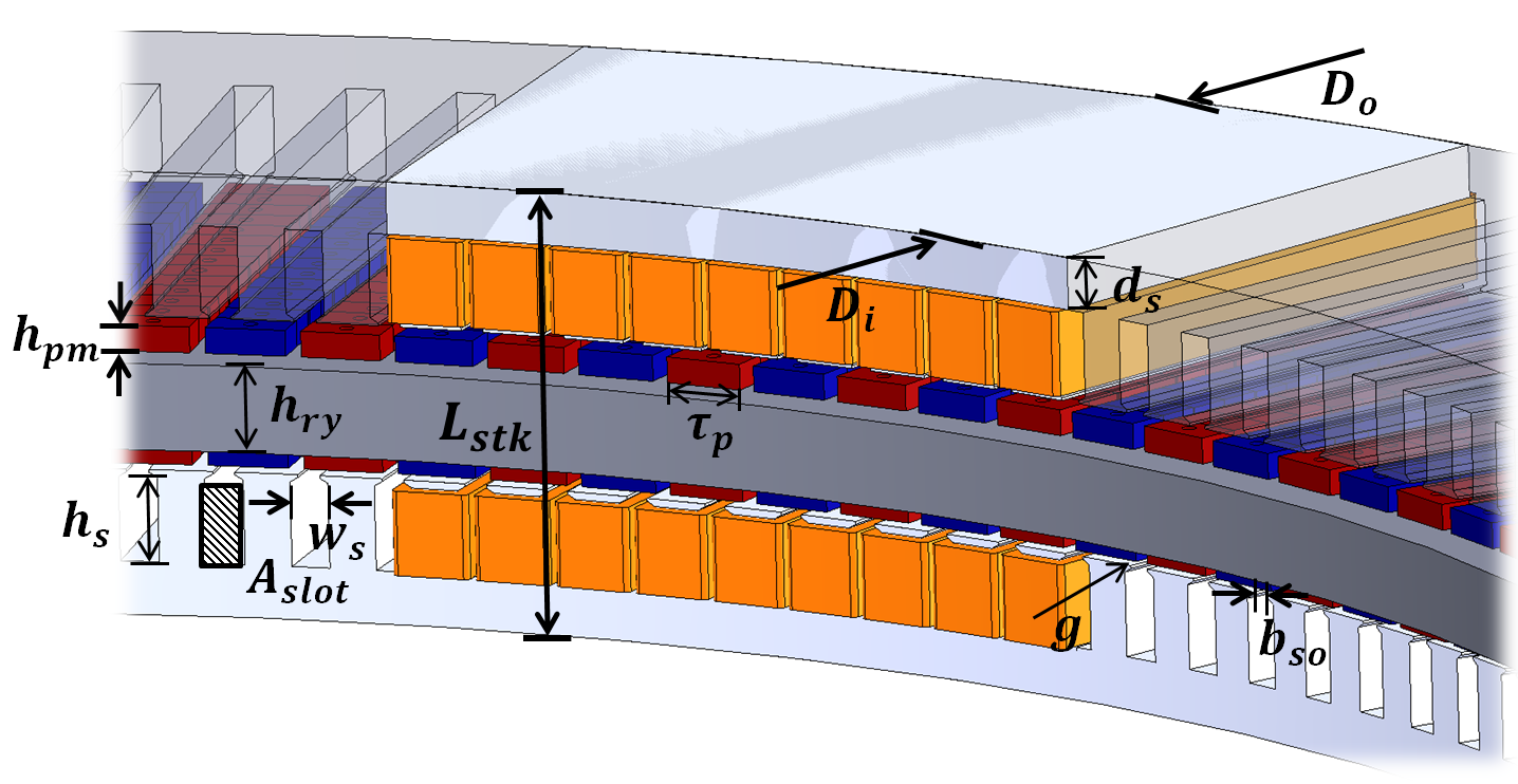 축방향 길이를 $L_{stk}$로 나타내었다. 고정자와 관계된 변수로 슬롯 면적을 $A_{slot}$, 슬롯 폭은 $w_{s}$, 슬롯 높이를 $h_{s}$,