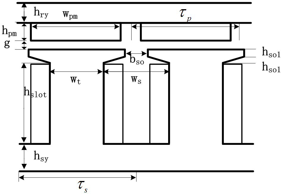 슬롯 오프닝을 $b_{so}$, 고정자 요크 두께를 $d_{s}$로 정의 하였다. 회전자와 관계된 변수로 영구자석 극간격을 $\tau_{p}$, 영구자석