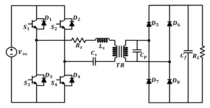 0.5로 고정한다. DC 입력 전압을 받는 인버터는 스위치는 $\pm V_{in}$ 구형파 전압을 생성하며, 직렬 연결 인덕터 및 직⋅병렬 연결 커패시터를