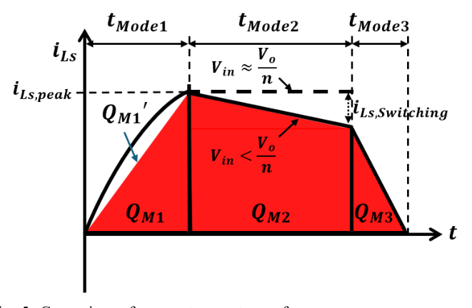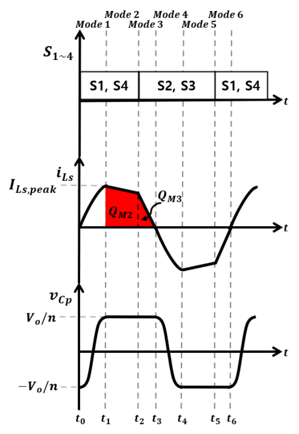 매우 낮으므로 직렬 공진 전류는 선형적으로 변화한다. 이를 전제로 두고 공진 전류를 해석했을 때, Fig. 3의 Mode 2와 Mode 3의 전류 적분 값 $Q_{M2}$, $Q_{M3}$는 각각 사다리꼴과 직각 삼각형과 같은 도형으로 근사화된다. 따라서