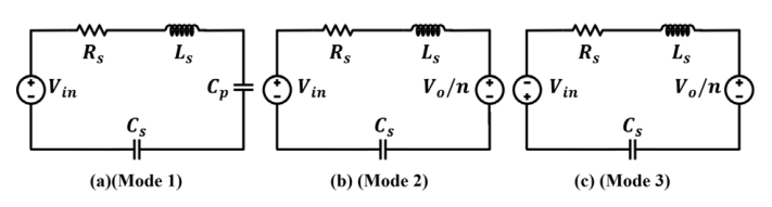 Fig. 3(a), 3(b), 3(c)는 각각 Mode 1, Mode 2, Mode 3에서의 공진 탱크 등가회로를 나타낸 것이다. 각 Mode에서 공진 전류의 기울기는 인덕터 양 단의
