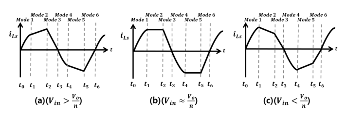 Fig. 4(a), 4(b), 4(c)는 각각 입력 전압 대비 출력 전압이 클 때, 같을 때, 그리고 작을 때의 변압기 1차 측 공진 전류 파형을 나타낸 것이다. 일반적으로 펄스 파워