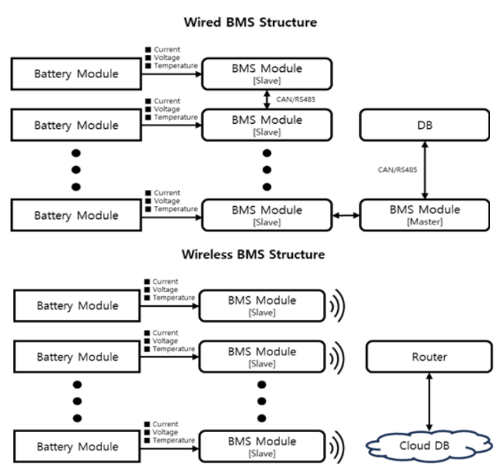 12]. Fig. 1은 기존 유선 기반 BMS 구조와 무선 기반 BMS 구조를 비교하여 나타낸 것으로, 무선 방식은 배선 제거를 통해 구조 단순화가 가능하다는 장점을