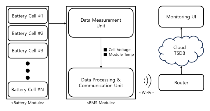 이러한 배경에서 본 논문은 셀 단위 BMS 보드에서 발생하는 계측 데이터를 무선 환경에서 지속적으로 수집하고, 클라우드 기반 TSDB에 저장한 뒤