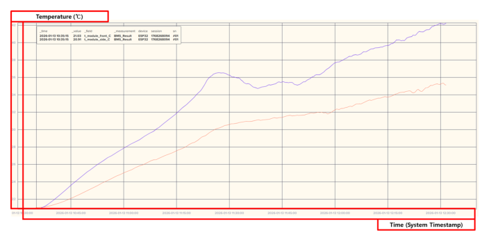 이상의 구현 및 실험 결과를 통해, 제안한 시스템이 실제 환경에서 셀 단위 전압 데이터와 모듈 단위 온도 데이터를 동시에 계측하고, 이를 하나의 실험