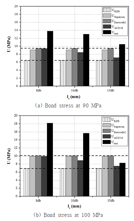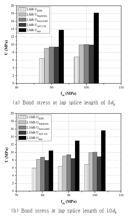 대해 기존의 Eurocode 2(2004)의 부착강도 산정식을 적용한 예측값과도 비교를 수행하였다. $U_{test}/U_{Eurocode2}$으로 확인할 수 있듯이, Eurocode 2(2004)의 부착강도는 전반적으로 실험값보다 낮게 분포되어 있으며, 특히 낮은 부착응력 영역인 8-10 MPa에서 편차가 크게 나타난 경향을 보였다. 이는