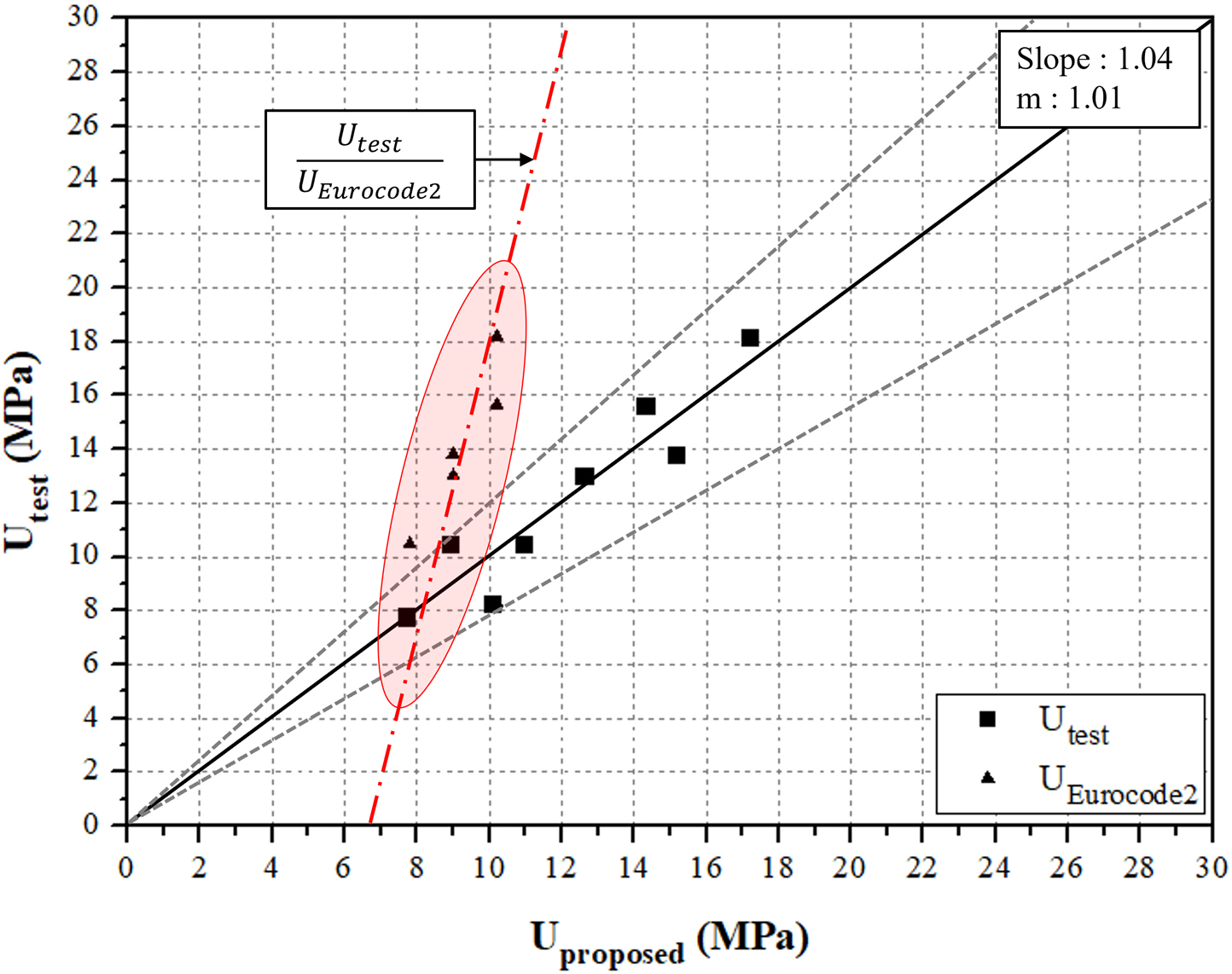 거의 동일한 수준의 부착강도를 예측하고 있음을 확인하였다. 또한, 기울기가 1.04, 잔차의 분산이 0.104로 나타났고, 실험값 $U_{test}$과
