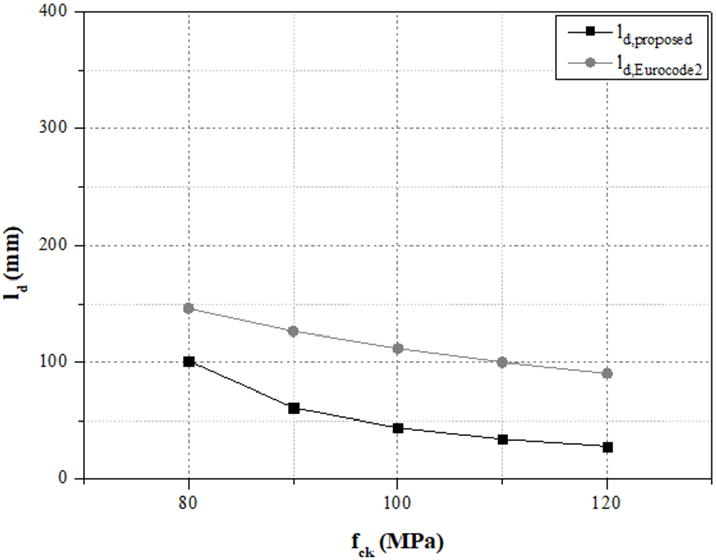 Fig. 5 Comparison of development length for Eurocode 2 and proposed equation