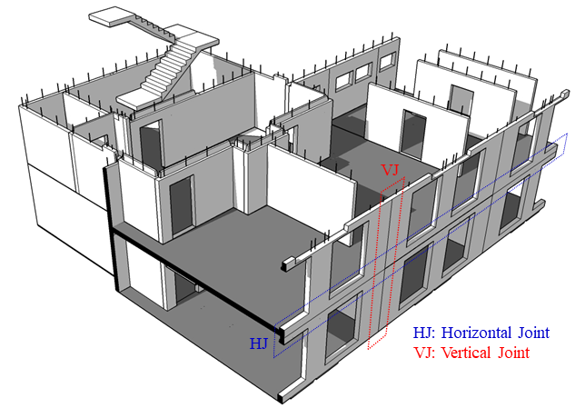 구분된다. 수직접합부에서는 벽과 벽사이의 전단저항에 의해 응력전달이 이루어진다. 반면에 수평접합부에서는 상하부 벽체 사이의 수평전단응력의 전달뿐만아니라