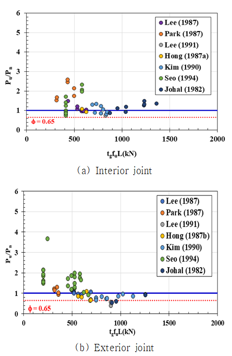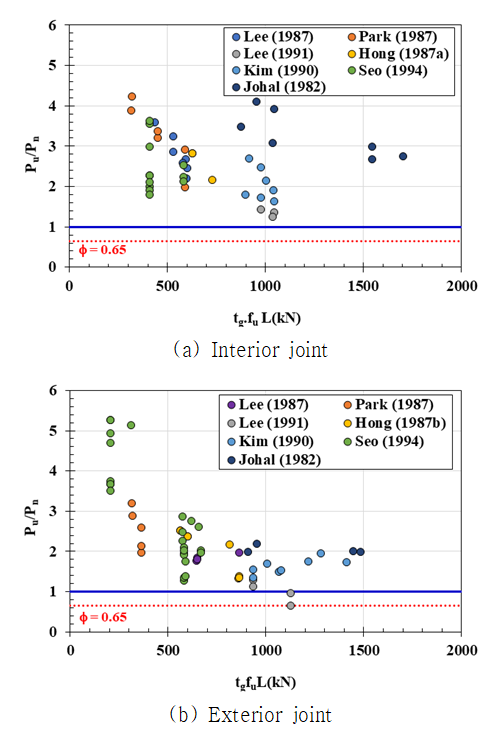 비($P_{u}/P_{n}$)는 0.53~1.31로서 분산 정도가 가장 작아 실험내력을 가장 근사하게 예측하는 것으로 나타났다. 반면에 외부접합부에서는