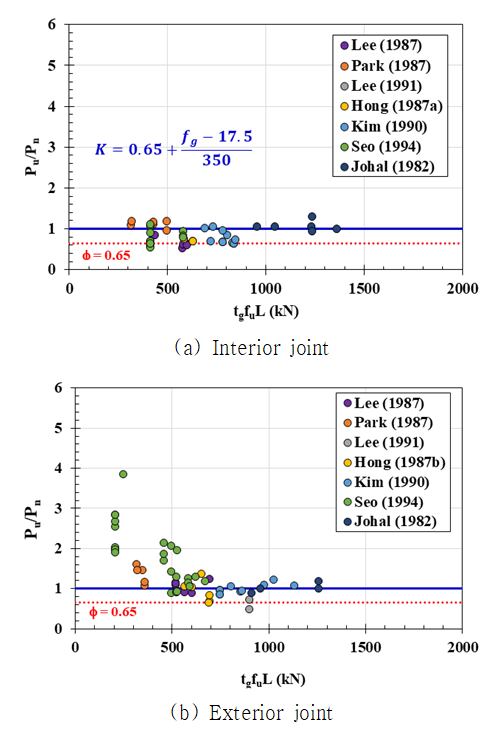 전술한 식들에 대한 적합성을 평가하기 위하여 기존에 국내외에서 수행되었던 벽-슬래브 수평접합부에 대한 압축실험결과 데이터를 수집한 뒤 이들 실험결과와