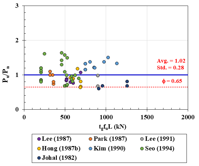 수정된 식을 적용하여 전체 외부접합부 실험체에 대한 공칭압축강도와 실험결과의 비를 나타내면 Fig. 15와 같이 좋은 대응을 보이는 것으로 나타났다.