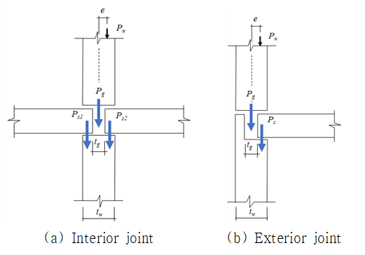 중력방향힘의 전달은 Fig. 2와 같이 상부벽체로부터 전달되는 수직방향 힘과 슬래브를 통하여 전달되는 수직방향 힘으로 구분될 수 있다. 수평접합부는 슬래브의 형태에 따라 Fig. 3과 같이 다양한 접합부 상세가 될 수 있다. 그림에서 Interior와 Exterior는 각각 내부접합부와 외부접합부를 나타낸다. 접합부에서 중력방향