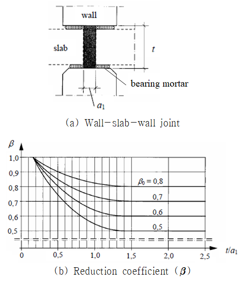 깔모르타르가 있는 경우에는 벽체강도에 대한 깔모르타르의 강도비($f_{cm}/f_{cw}$)인 $\beta_{0}$를 산정한 뒤, Fig. 4의 그래프를 이용하여 구할 수 있다. 단 이 식을 적용하기 위해서는 깔모르타르의 강도는 벽체강도의 50 % 이상이 되어야 한다.
