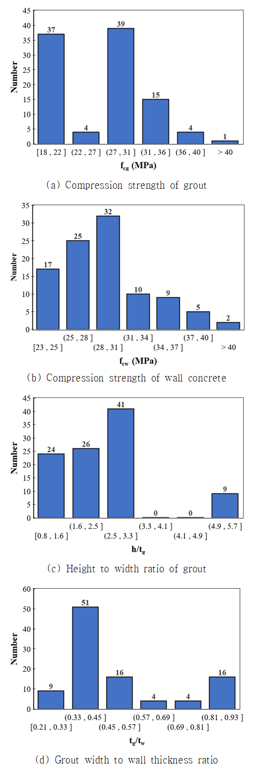 그라우트 폭의 비에 따른 실험체 갯수를 나타내면 Fig. 5에 나타낸 바와 같다. 그라우트의 압축강도($f_{cg}$)가 18~40 MPa 범위인 실험체의 개수는 99개, 그 이상은 1개 실험체이다. 벽체