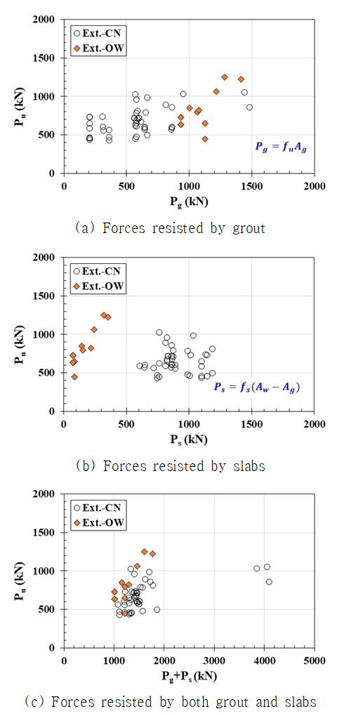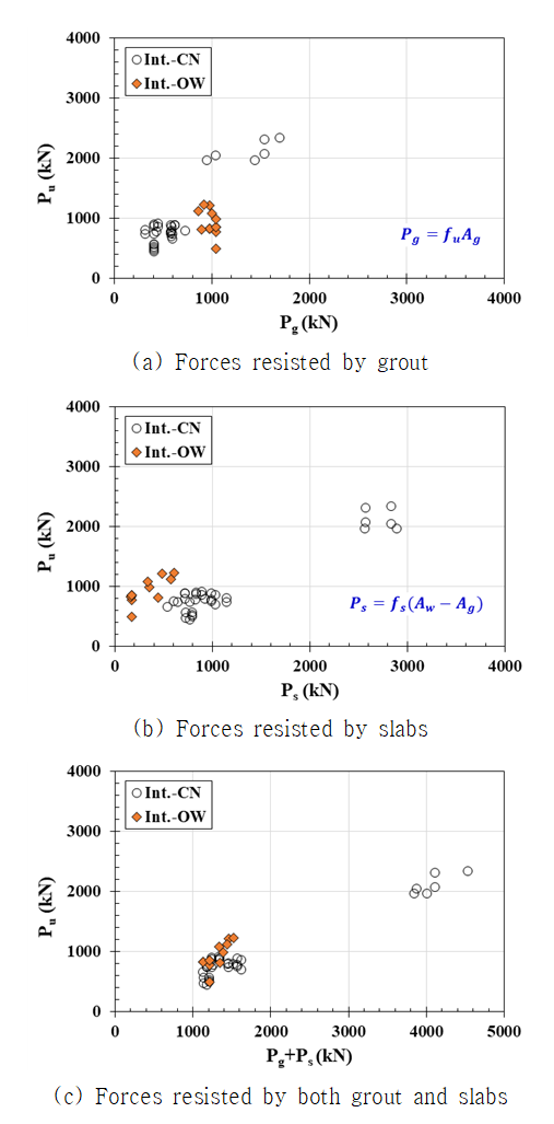 따른 실험 최대 축강도의 변화를 보면, 실험체들의 최대 축강도가 그라우트에 의해 지지되는 축력뿐만아니라 슬래브에 의해 지지되는 축력의 크기와 비례관계가