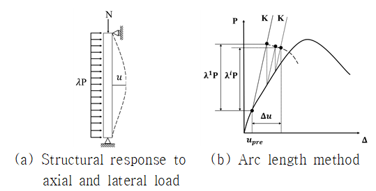 도출하였다. Fig. 2(a)에 제시된 축력과 횡력을 받는 구조물의 저항함수 도출은 Fig. 2(b)의 arc length method를 사용하였다. Arc length method는 저항력 감소를 나타내는 비선형 거동을 효과적으로 해석할 수 있다.