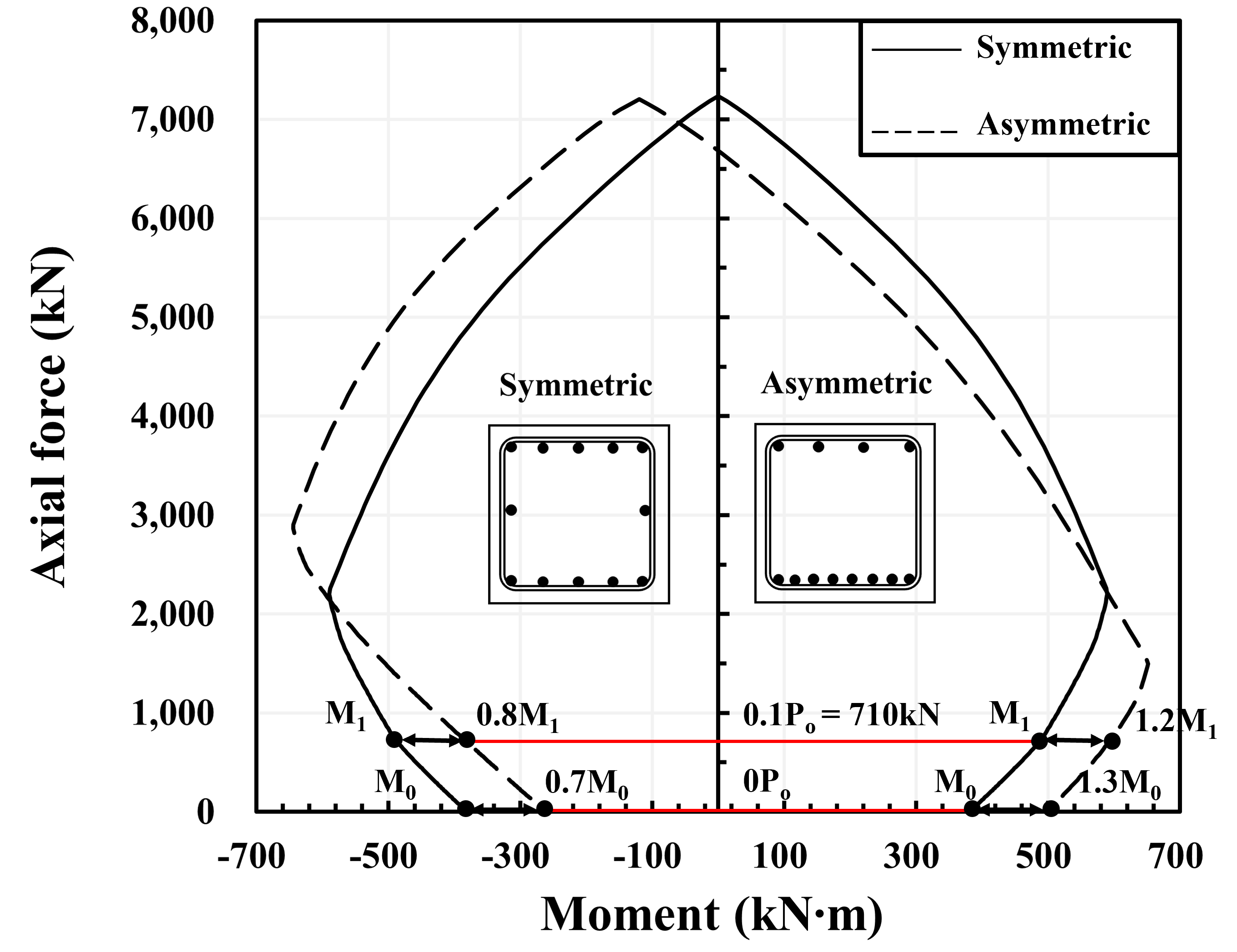 UFC 3-340-02(DOD 2008) 예제 단면에 대해서 단면 해석을 한 결과 축력에 따라 대칭 단면과 비대칭 단면의 휨 모멘트 차이가 다르게 발생하였다. 최대 축력의 10 % 축하중이