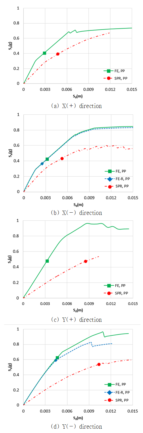 1) 비선형 정적 해석을 통한 성능곡선을 비교하면 고정단 모델(FE)이 들림 허용 고정단 모델(FE-R)과 스프링 모델(SPR)에 비해 강성이 가장