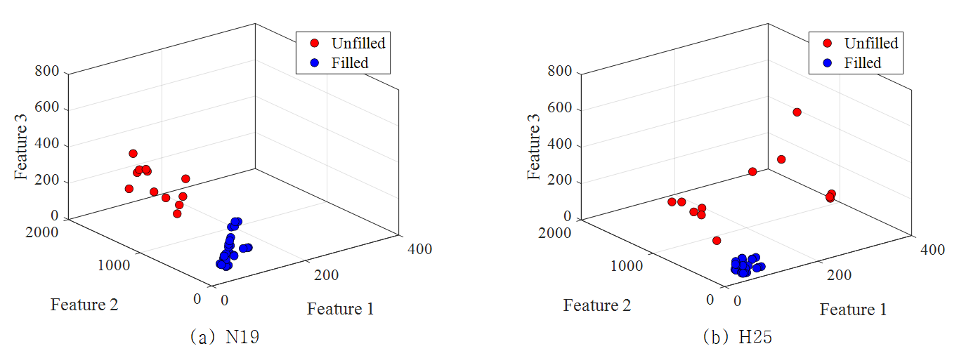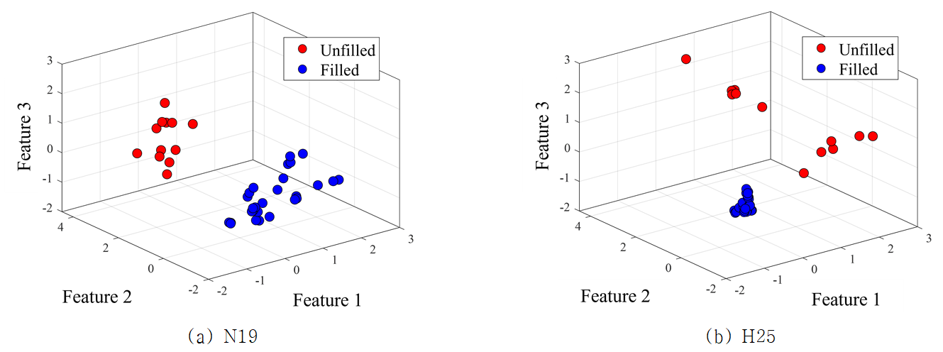 그 결과, N19 시편과 H25 시편 모두 충전에 따른 군집의 명확한 분리가 확인되었다. 이와 같은 결과는 향후 실제 구조물의 비파괴 검사 및 건전성
