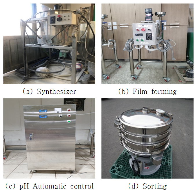 ์บก์์ ์ ์กฐ๋ Fig. 1(a)์ ์ฅ๋น๋ฅผ ํตํ์ฌ ์ฝ์ด ์ฌ๋ฃ๋ฅผ ํฉ์ฑํ๋ฉฐ, ํฉ์ฑ๋ ์ฝ์ด๋ Fig. 1(b)์ ์ฅ๋น๋ฅผ ํตํ์ฌ ๋ง ํ์ฑ์ ์ํํ๋ค. ์ด๋ Fig. 1(c)์ ์ฅ๋น๋ฅผ ํตํ์ฌ pH๋ฅผ ์กฐ์ ํ๋ฉด์ ํฉ์ฑํ๋ค. ์ต์ข