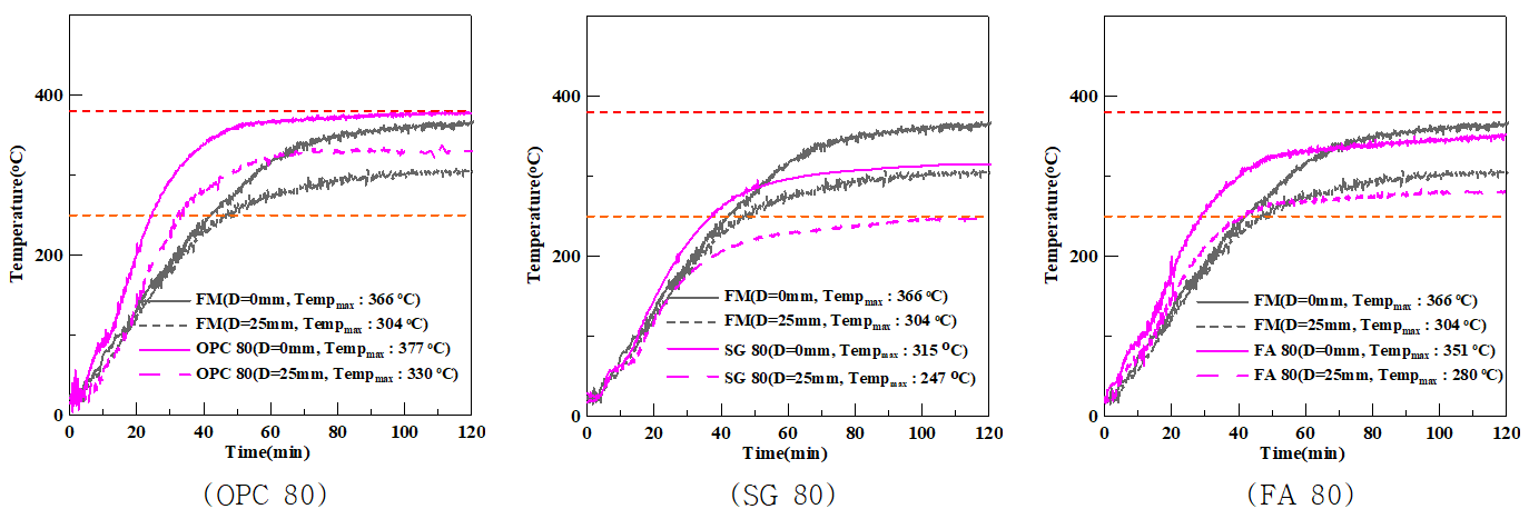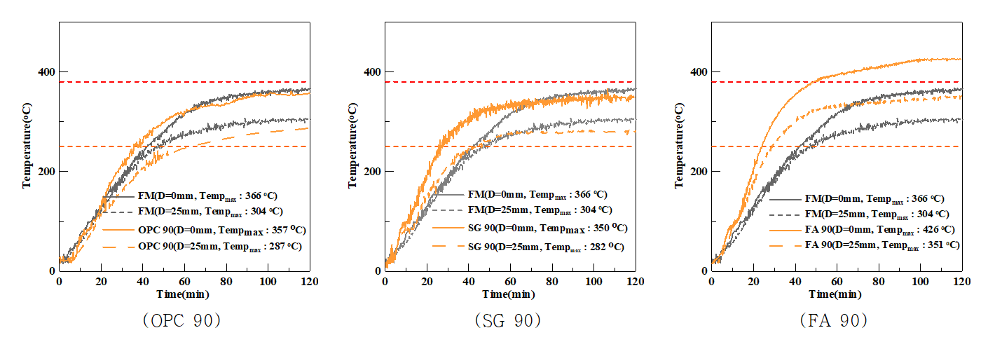 °C). OPC 및 SG 타입은 S/M 0.90에서 0.85로 낮아질 때 수열 온도가 낮아졌으나, 0.80 이하부터 오히려 증가하는 경향을 보였다.