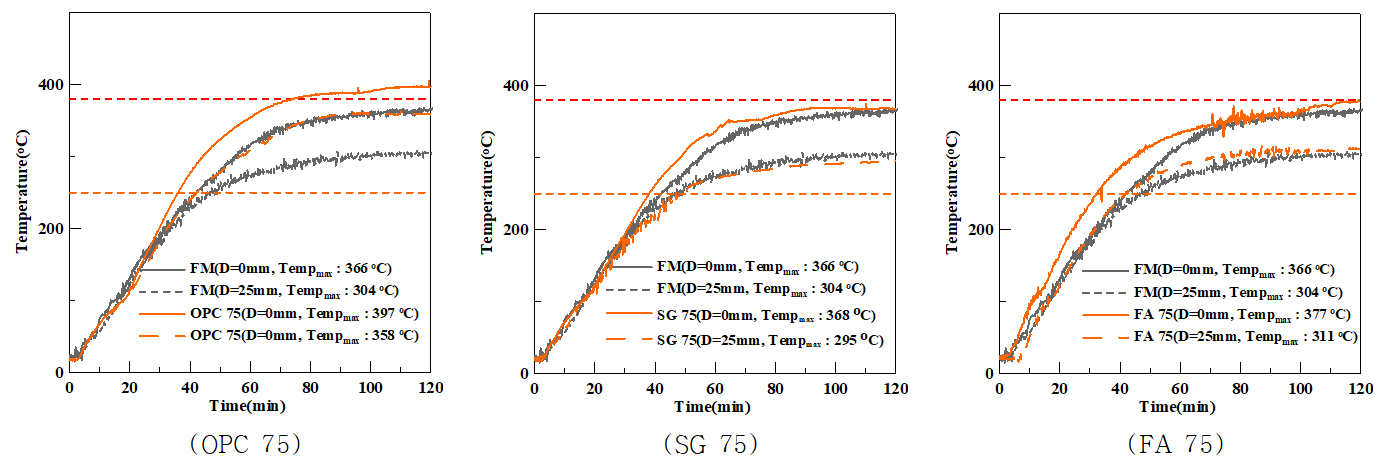 이는 고온에 따른 물리적 변형이나 용융 현상으로 단열 성능 저하에 영향을 미친 것으로 보여진다. 한편, FA 기반 모르타르는 가열 시험에서 높은 잔존