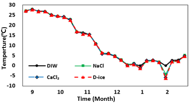시멘트 페이스트가 낮은 온도에서 더 큰 압축강도 저하를 나타낸다고 보고하였다(Althoey 2021). 또한 시멘트의 반복적인 온도 변화 환경에서 프리델염이 생성되며 이로 인해 휨강도가 저하된다고 밝혔다(Qiao et al. 2018). 다양한 제설제(NaCl, CaCl2, 저염화물 제설제(CH3COONa-MgCl2~6H2O(40%)-CH3COONa-NaCl(60%), LCD)에 노출된 콘크리트를 대상으로 ASTM C672(2003) 기준의 동결융해 시험을 수행하여, 스케일링 손실을 확인하였다(Lee 2010).