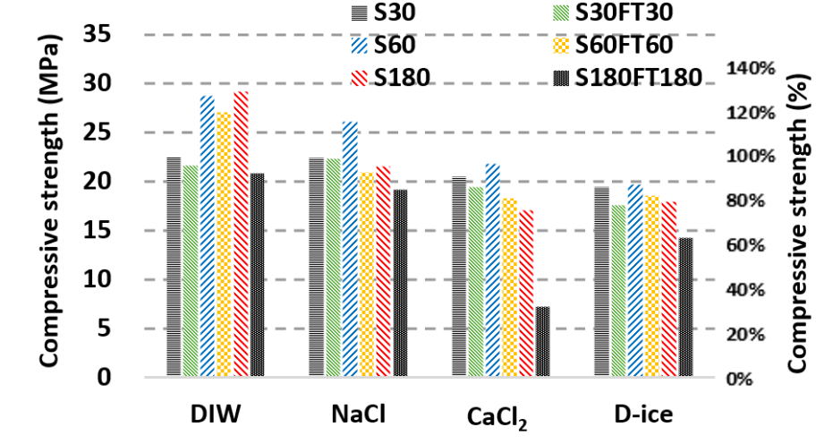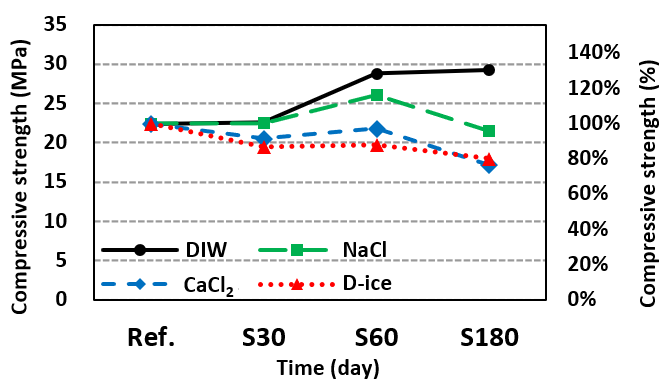 86 %의 강도를 나타냈다. 반면, CaCl2 및 D-ice에 노출된 시편의 강도는 각각 약 32 % 및 64 %로 DIW와 NaCl와 동일한 실험 진행 후보다 압축강도가 급격히 감소하였다.