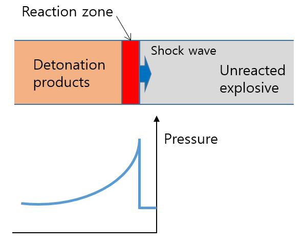 zone), ํํ๋ฐ์์ด ์ง์ค์ ์ผ๋ก ์ผ์ด๋๋ ๋ฐ์๊ตฌ๊ฐ(reaction zone), ํํ๋ฐ์์ ๊ฒฐ๊ณผ๋ก์ ์๊ธฐ๋ ๋ถ์ฐ๋ฌผ ์์ฑ ๊ตฌ๊ฐ(detonation products