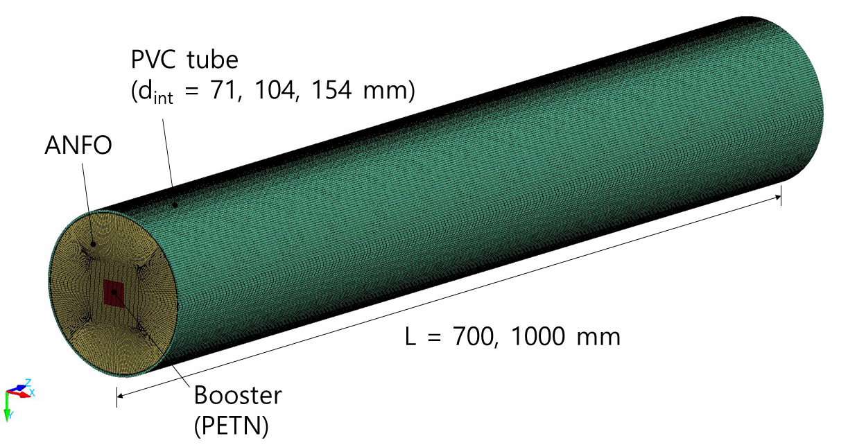 ์ด ์ฐ๊ตฌ์์๋ ๋น์ด์์ ํญ๋ฐ ํน์ฑ์ ๋ํ๋ด๋ ANFO ํญ์ฝ์ ๋ํ ์ค๋ฆฐ๋ ํญ๋ฐ์คํ(cylinder test, Bohanek et al. 2023)์ ALE (Arbitrary-Lagrangian-Eulerian) ํด์๊ธฐ๋ฒ(LSTC 2020; Abedini et al. 2020)์ ์ฌ์ฉํ ์ ํ์์๋ฐฉ๋ฒ์ผ๋ก ํด์ํ์๋ค. ์ค๋ฆฐ๋ ์ง๊ฒฝ๊ณผ ๊ฐ์ ํญ๋ฐ์กฐ๊ฑด(๊ฒฝ๊ณ์กฐ๊ฑด)์ ๋ณํ๊ฐ ํฝ์ฐฝ๋ฅ (์ฒด์ ๋ณํ๋ฅ ), ๋ฐ์์๋ ๋ฐ ๊ธฐํ ๊ด๋ จ ์ธ์์ ๋ฏธ์น๋
