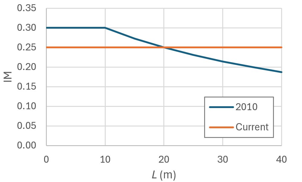 Fig. 1에 현행 및 이전 기준에서 규정하고 있는 충격계수를 비교하여 나타내었다. 이전 기준의 충격계수는 경간 길이가 20 m보다 짧은 경우에는 현행 기준의