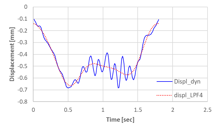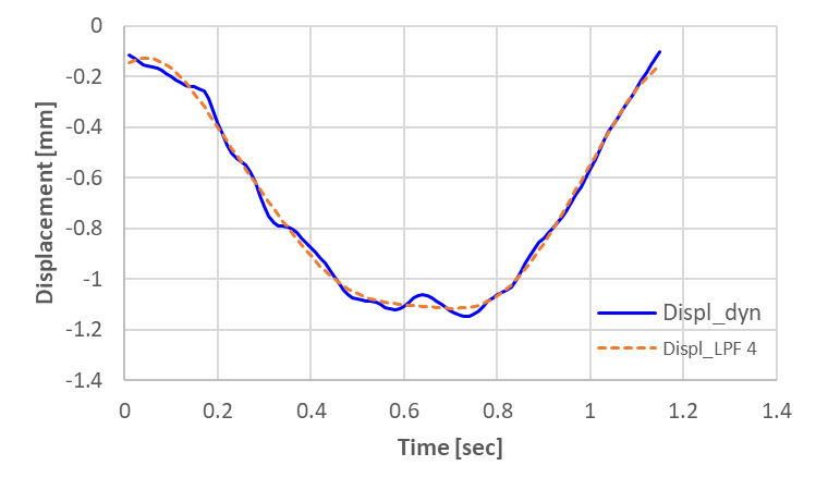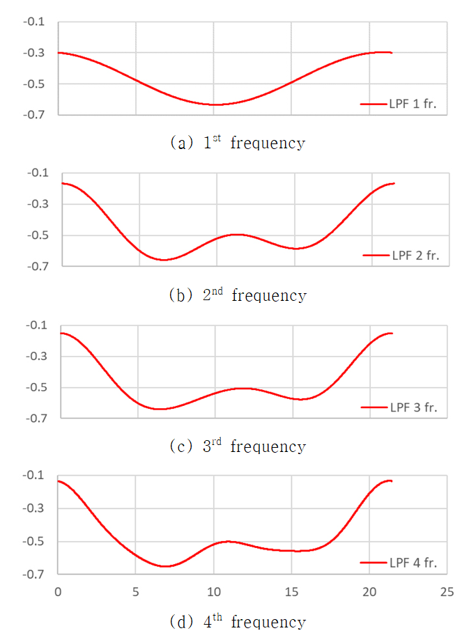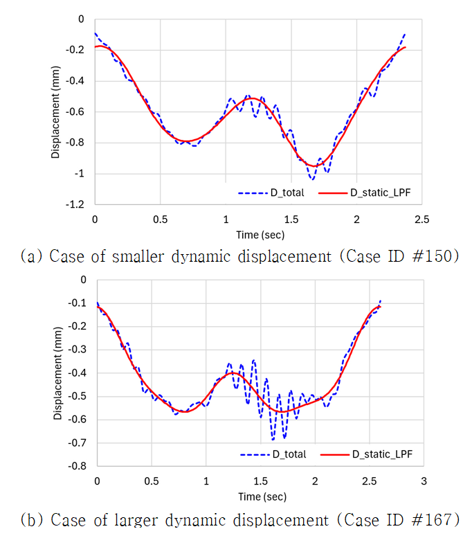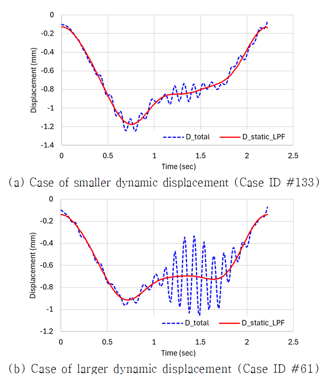 1) 충격계수를 도출하기 위하여 정적 최대변위가 필요하며, 이 연구에서는 저역 통과 필터(LPF) 방법을 사용하여 정적 최대변위를 산출하였다. LPF에는