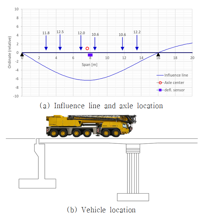 LBT의 재하시험은 2차에 걸쳐 수행되었으며, 차수별 HS-WIM으로 측정된 차량의 제원은 Table 2와 같다. LBT의 제원에서 3축과 4축 사이 축간 거리는 9 m를 초과하여 매우 크다. 첫 축과 마지막 축 사이의 거리인 최원축거도 15 m를 초과하여,