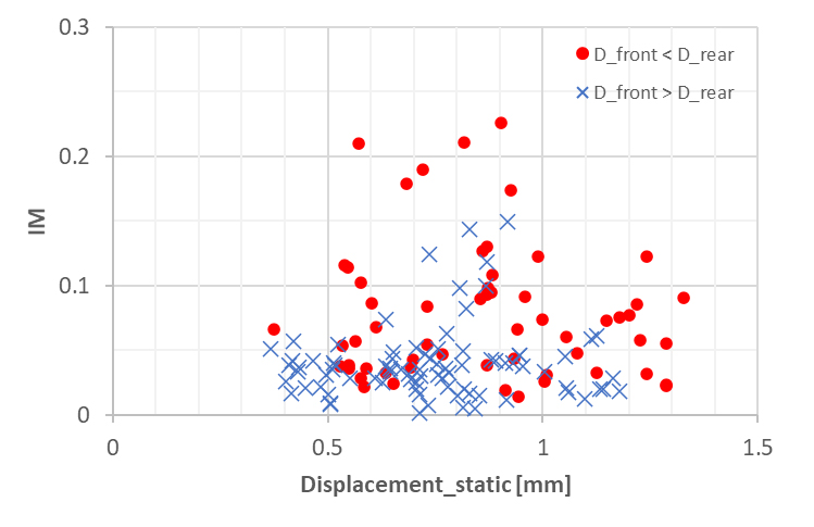 전, 후반 축의 중량 배분이 충격계수에 미치는 영향을 확인하기 위해 Fig. 20에 충격계수 분포를 도시하였다. 그림에 나타난 바와 같이, 충격계수가 0.2를 초과하는 경우는 모두 후반 2개 축의 중량이 전반 3개 축의 중량보다