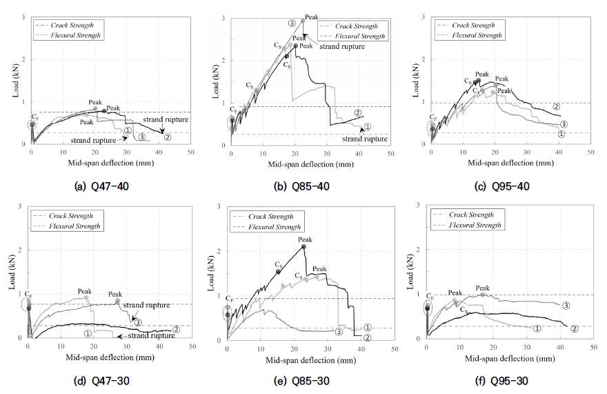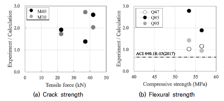 Q47-40과 Q47-30의 휨 유효계수 평균은 각각 0.43 및 0.50으로 나타났으며, 휨강도 도달 시 주근 방향 CFRP 스트랜드의 인장응력은