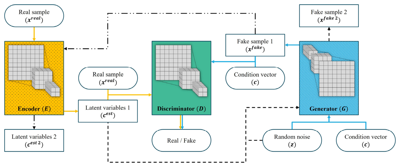 ๋ฐ์ดํฐ $x^{real}$๋ก๋ถํฐ ์กฐ๊ฑด ํํ $c^{est} = E(x^{real})$์ ์ถ์ ํ๋ค. ์์ฑ์ $G$๋ $(z, c)$๋ฅผ ์