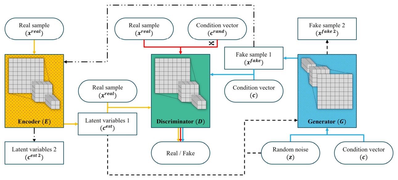 ๋น๊ตํ๋ฉฐ ์กฐ๊ฑด ๋ณํ ๋ฐ์์ ํ์ตํ๋ค. ๋ํ InfoGAN(Chen et al. 2016) ๋ฐฉ์์ผ๋ก $E(x^{fake})$์ ์กฐ๊ฑด $c$์ ์ผ์น์ฑ์ ํ์ต์์ผ ์์ฑ์๊ฐ ์กฐ๊ฑด์ ๋ฌด์ํ์ง ์๋๋ก ์ ๋ํ๋ค. ์ด ๊ตฌ์กฐ๋ ์ฌ๋ฌ ์์ค ํญ์ผ๋ก ์ ์๋๋ฉฐ