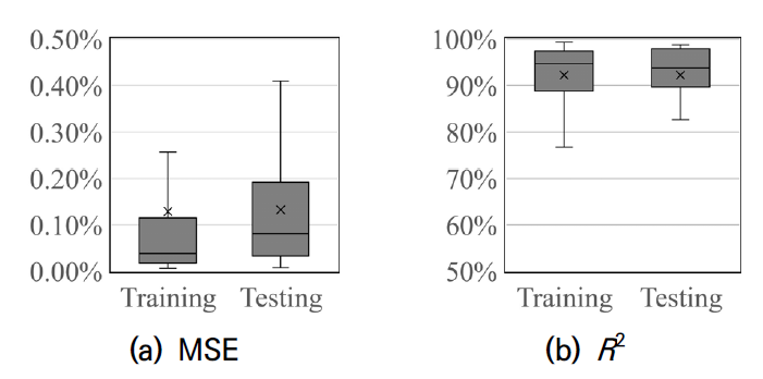 ๊ฒฐ๊ณผ๋ ํ๊ท ์ ์ผ๋ก ๊ฐ๊ฐ 8.15 %, 0.13 %์ผ๋ก ์ ๋ฐ์ ์ผ๋ก ๋ฎ๊ฒ ๋ํ๋ฌ์ผ๋ฉฐ, $R^2$์ ๊ฒฐ๊ณผ๋ ํ๊ท ์ ์ผ๋ก 0.92๋ก ๋์ ์์ค์ ๋ณด์ฌ ์ ์๋