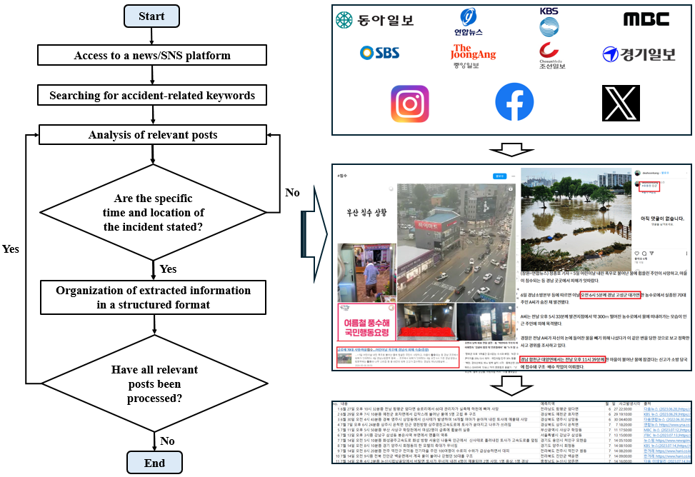 홍수 및 침수 관련 게시물을 조사하고 활용할 수 있는 방법을 도출한다(Debreceny et al., 2017). 다음으로 2020년부터 2024년까지 침수 피해사례 관련 미디어 데이터를 수집하여 DB를 구축한다. 이는 키워드 검색 및 검증의 과정으로 진행되며,