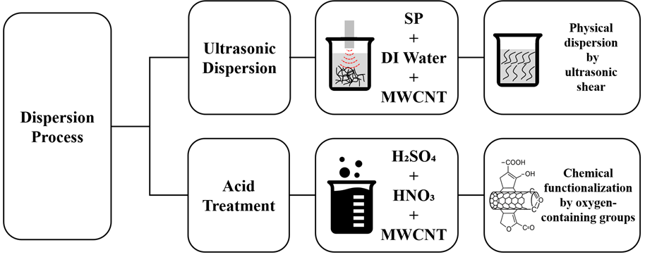 본 연구에서는 초음파 분산과 산처리 두 가지 방법을 적용하였고, 분산 방식에 따른 기계 및 열적 성능 변화를 평가하였다(Kwon et al., 2024; Ghozatloo et al., 2014).