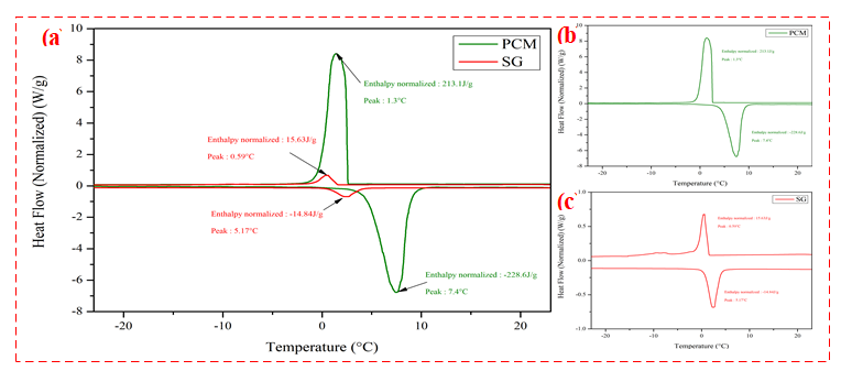 DSC 분석 결과에서 보인, Sol-Gel PCM의 상변화 구간 특성에 의한 것으로 상변화는 약 0~5℃ 범위에서 발생하며, 이는 승온 종료 시점보다