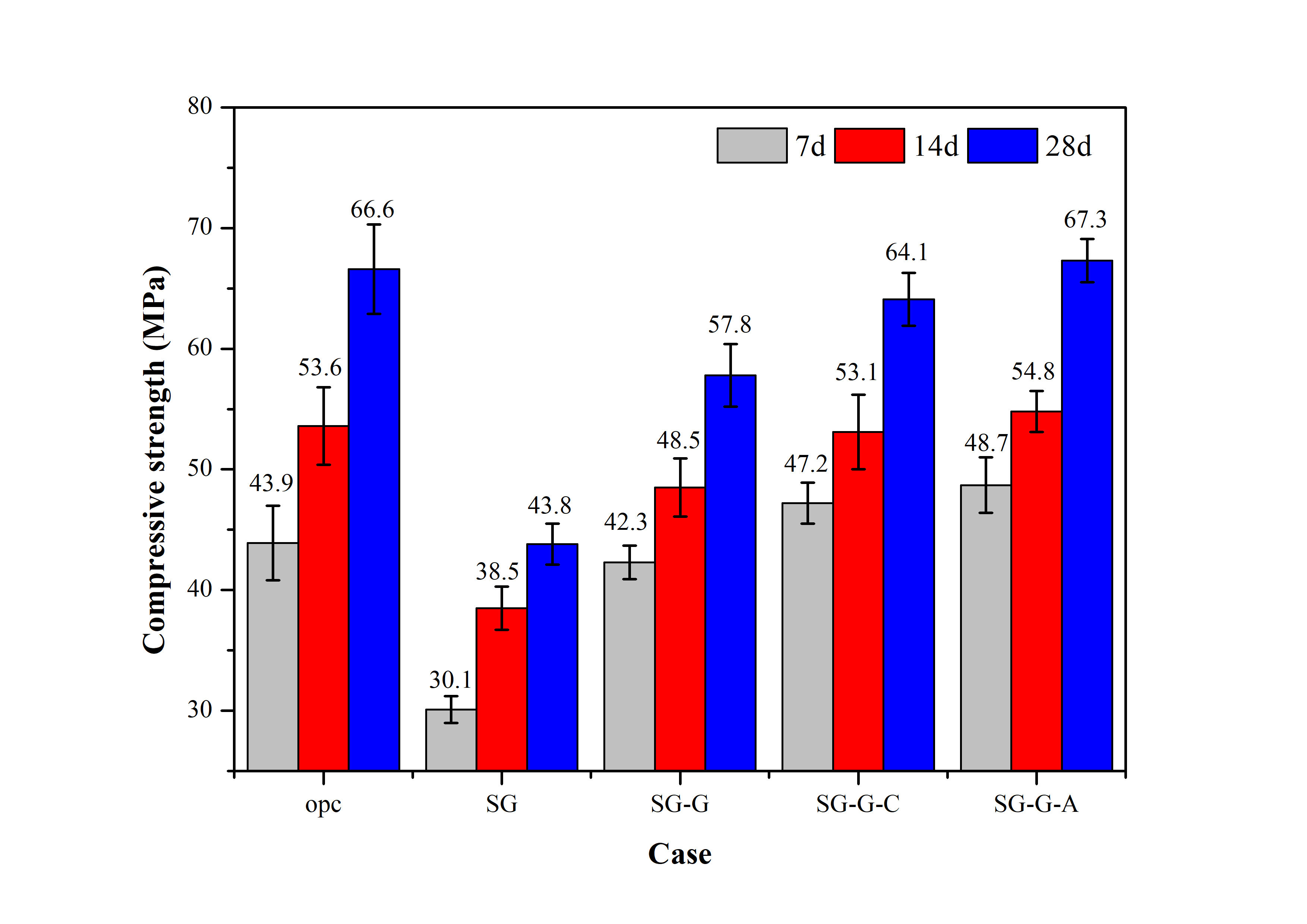 코팅을 하여 골재를 제작하고, 이를 바인더 중량비에 10 % 치환한 GGBS를 모르타르에 적용하였다. 특히 MWCNTs를 초음파 분산한 경우와 산
