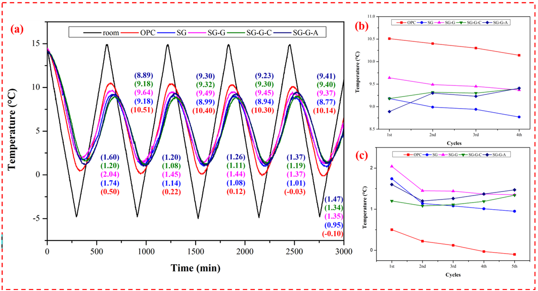 Fig. 6. Thermal Cycling Performance of PCM-modified Mortars. (a) Temperature-time Profiles over Four Thermal Cycles, (b) Variation of Peak Heating Temperature with Cycle Number, (c) Variation of Cooling-End Temperature with Cycle Number