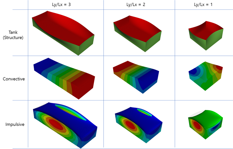 한편, 대류성분은 저주파 영역에서 탱크 벽체의 변형모드와 주파수 대역이 분리되므로, 강체 탱크를 가정한 유체의 자유진동 해석 결과를 적용할 수 있다.