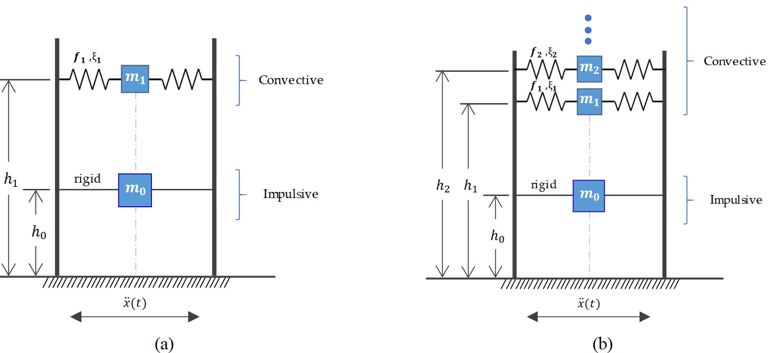액체저장탱크의 유체 동적 거동은 충격성분(impulsive)과 대류성분(convective)으로 구분되며, ACI 350.3-20(2021), NICEE Guidelines(2007), Eurocode 8-4(2006), NZSEE(2009) 등 주요 해외 설계기준에서는 이를 근사화된 등가 스프링-질량 모델(equivalent spring–mass model) 로 이상화하여 설계식을 제시하고