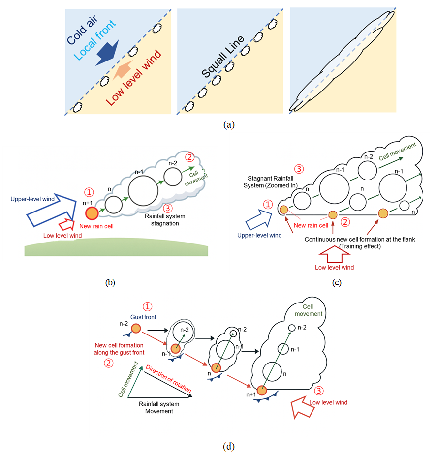 Fig. 1(d)는 포워드 빌딩형(forward building)으로 자기 증식형 다중세포 메커니즘에 해당한다. 이 유형은 진행 방향 전방에 새로운 강우 세포를 생성하는