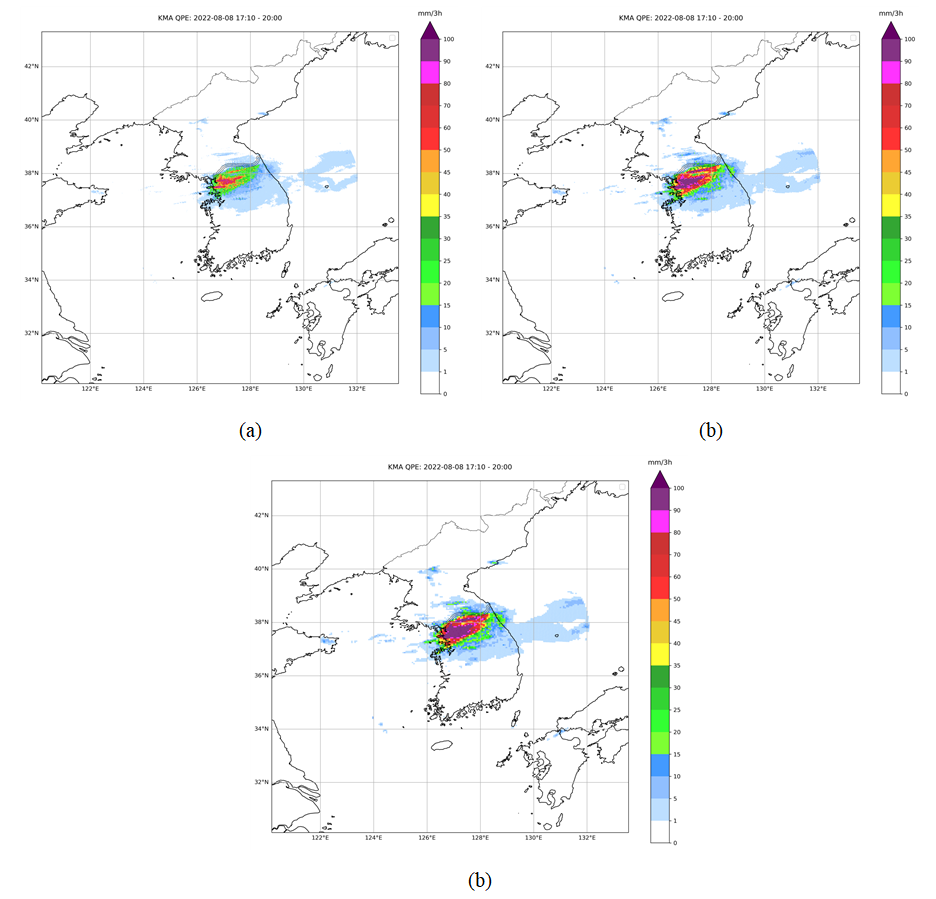 있었으며, 해상도가 5 km로 낮아지면 평균 집중호우 지역이 넓어지고, 정체형, 비정형 유형의 빈도가 증가하였다. 또한, 4년간의 분석을 통해 최대