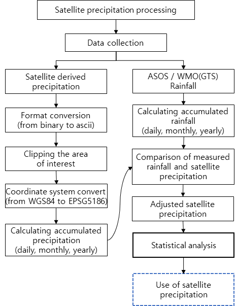 자료를 수집한다. 북한 강우자료의 경우 위성강수 자료와 비교를 위해 시간해상도를 일치시키기 위해 일강우량 자료를 생성한다.