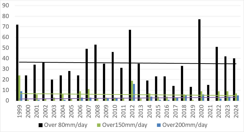 반면 극한일강수량(일최대강수량)은 증가하는 경향을 나타낸다고 제시하고 있다(Kwon et al., 2019). 또한, 북한은 여름에는 동아시아 몬순의 영향을 크게 받으며 폭우(Torrential Rain, TR) 현상은 우기(Rainy Season, RS)에